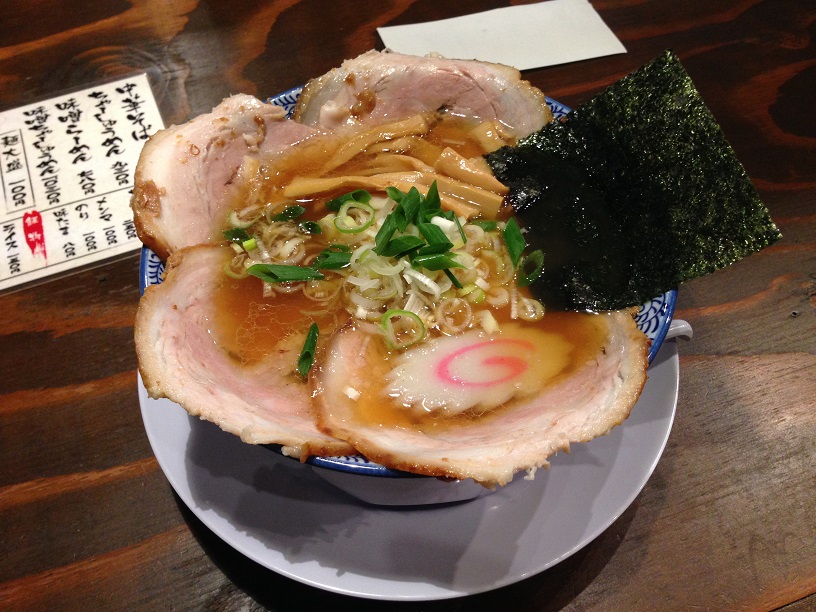 肩ロースが2枚に、豚バラ、味玉、めんま、水菜、白髪ネギ、干しエビ、