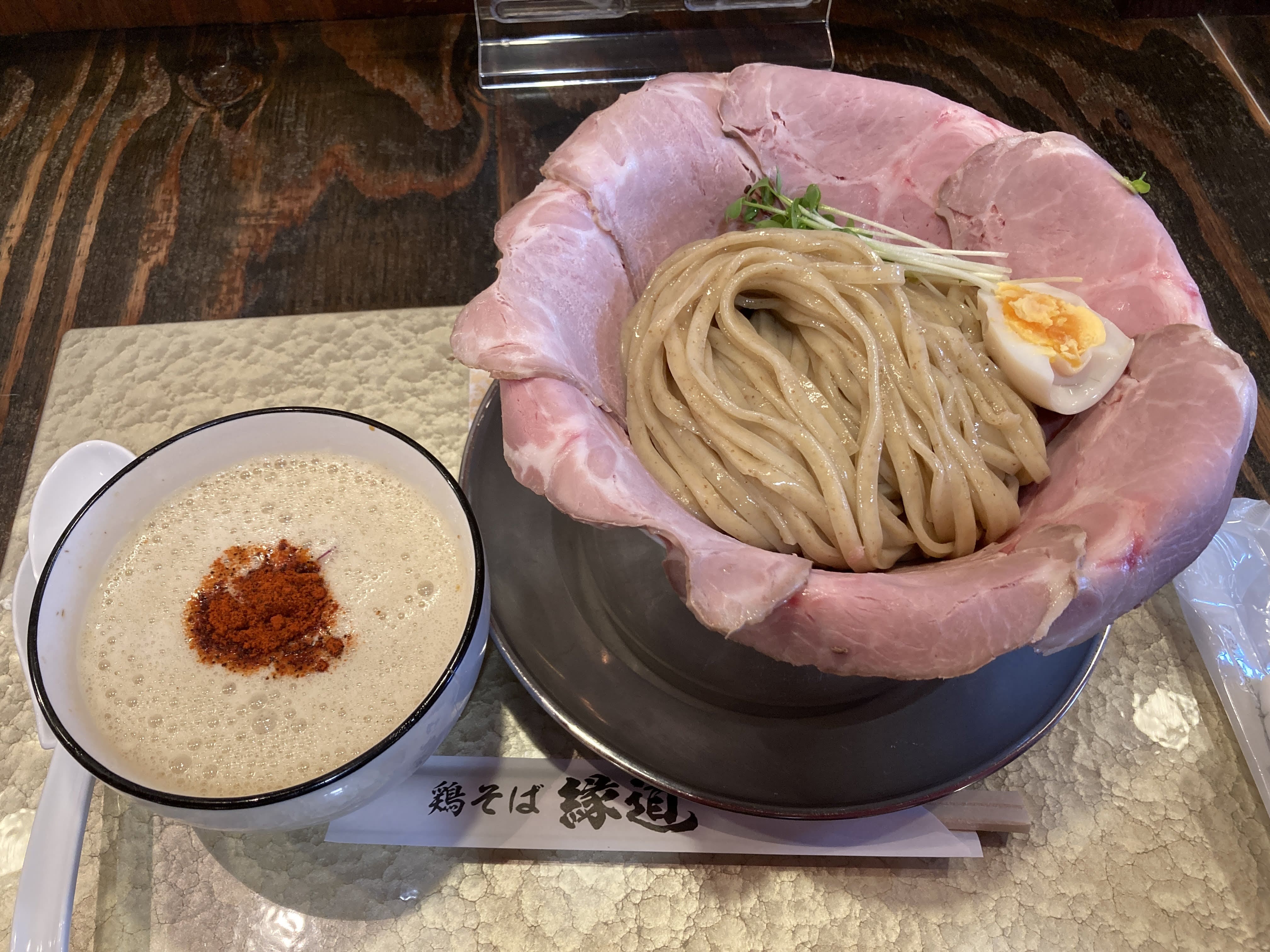 つけ汁の器に花びら状に置かれたレアチャーシューは、