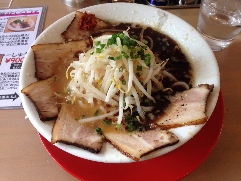 自家製とんこつスープに手作りマー油、ちょいと添えた辛し味噌。トリプルテイストの『あかりとんこつ』にあぶりちゃーしゅう6枚のった『あかりちゃーしゅう』