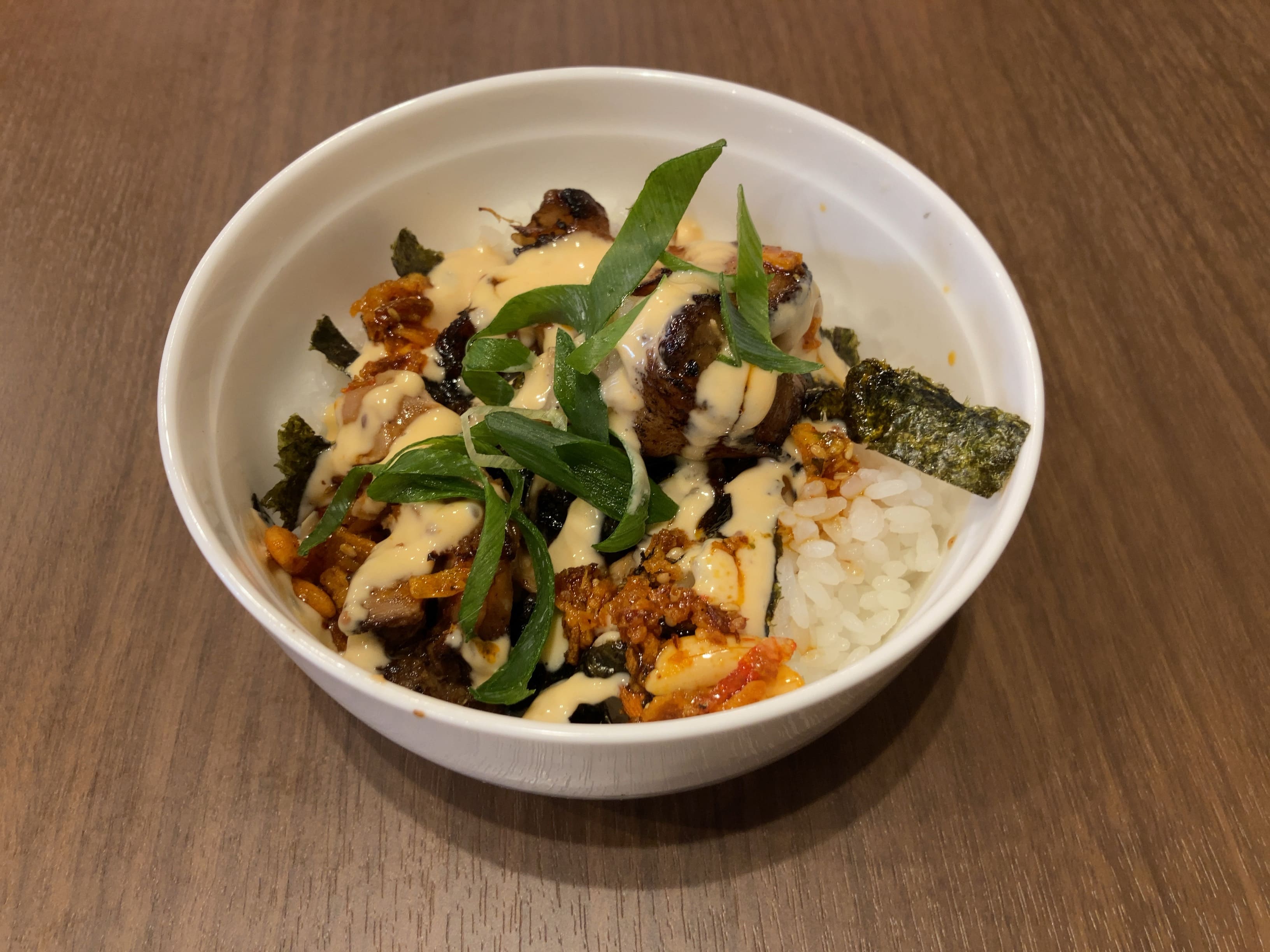 丼の中央には酸味のある辛子味噌が乗せられています。